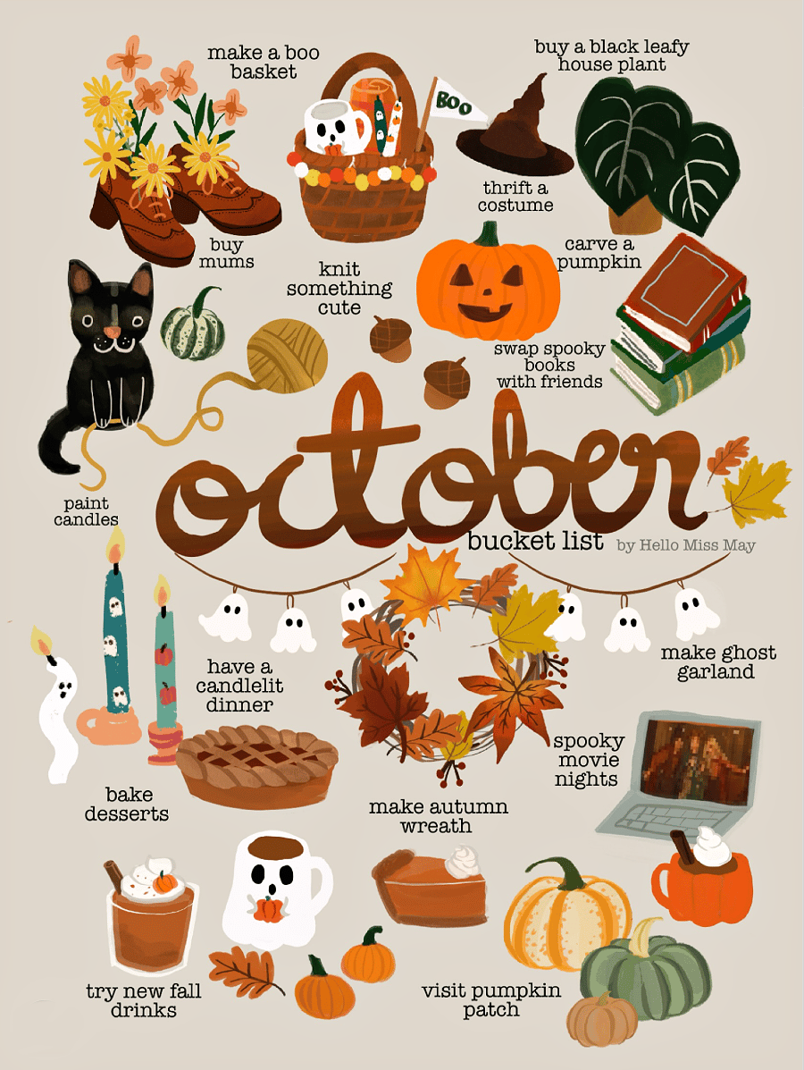 As October’s crisp air arrives, the "October Bucket List" begins a season of fun. Start by making a "boo basket" with treats to surprise a neighbor, then buy vibrant mums to brighten your porch. Thrift a whimsical costume like a witch’s hat or cape, and carve a grinning pumpkin for a festive glow. Knit a cute ghost or swap spooky books with friends for cozy reads. Paint candles for an eerie candlelit dinner, craft a ghost garland, and bake pies or cakes to fill the kitchen with warmth. Enjoy...