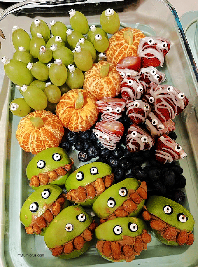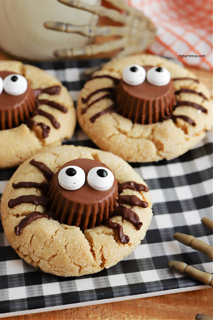 We use our easy peanut butter blossoms cookie recipe and make these cute spider snacks. These Spider Peanut Butter Cookies are made with a mini Reese’s peanut butter cup for the body and candy googly eyes. Your little ghosts, goblin, princess’ and super heroes will certainly gobble up these Halloween treats.