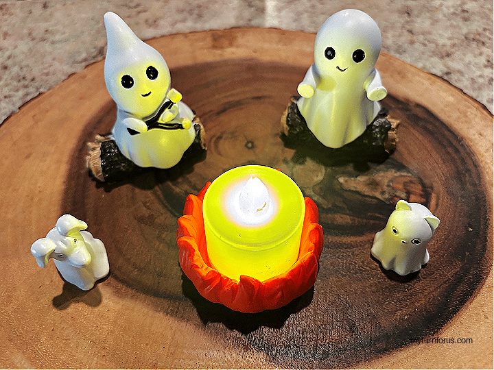 And every year I pull out my favorite little Halloween figurines (see at the top) and sometimes I am able to add a few. This year I found these super adorable tiny little ghosts roasting marshmallows around a flickering faux campfire tea light with a ghost dog and cat. It's like a tiny Halloween campfire, whimsical but spooky, tale come to life! I just purchased them this year and was so happy when they arrived. I so LOVE THEM. They make my heart happy!