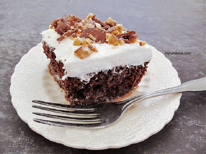 Ever come across a dessert so divine, it could ‘knock you naked’? This easy box cake improv recipe is just that. Featuring a luscious blend of chocolate, caramel, cool whip and Health bars, one bite will leave you in tastebud heaven. And this Knock you Naked Cake recipe just might knock your socks off. Some call it a better than sex cake recipe!
